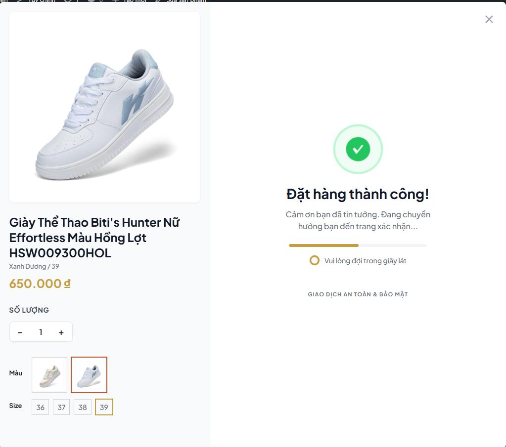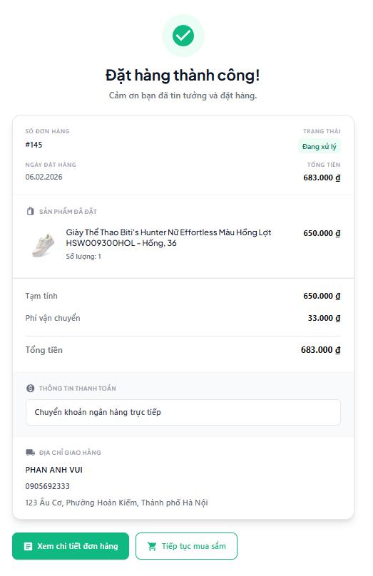 - Trang thông báo đặt hàng thành công và xác nhận đơn hàng chuyên nghiệp.