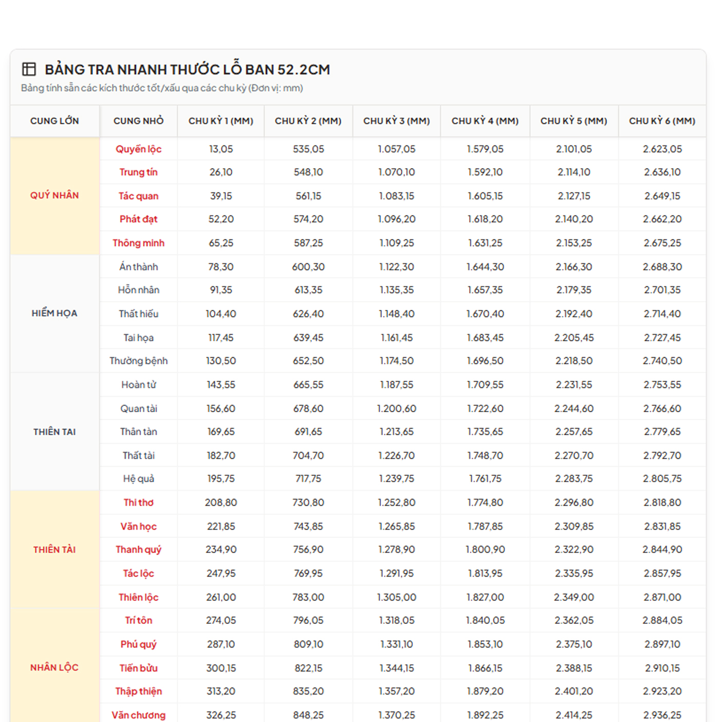 Bảng tra nhanh tiện lợi: Thay vì phải kéo từng mm, khách hàng có thể theo dõi bảng tổng hợp các kích thước rơi vào cung Quý Nhân, Thiên Tài, Tác Lộc… ở các chu kỳ xa hơn.