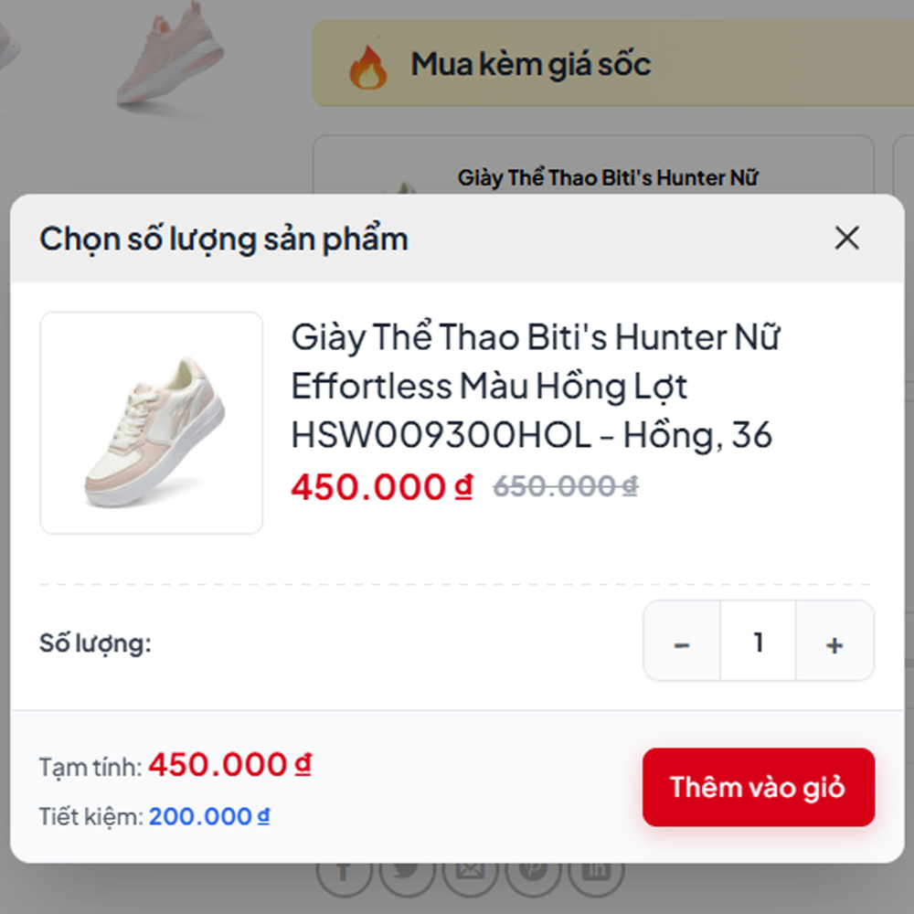 Popup chọn biến thể: Khi khách hàng nhấn “Chọn thêm”, một cửa sổ popup sẽ hiện ra (Hình 2) cho phép chọn Size, Màu sắc ngay lập tức mà không cần tải lại trang. Đây là điểm chạm cực kỳ quan trọng giúp tăng trải nghiệm người dùng (UX).