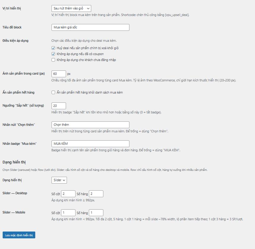 - Hiển thị sản phẩm bán kèm giá deal trên single product (vị trí tùy chọn hoặc shortcode).